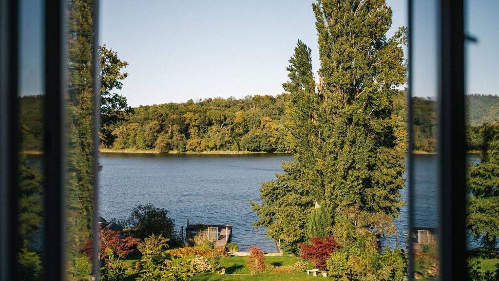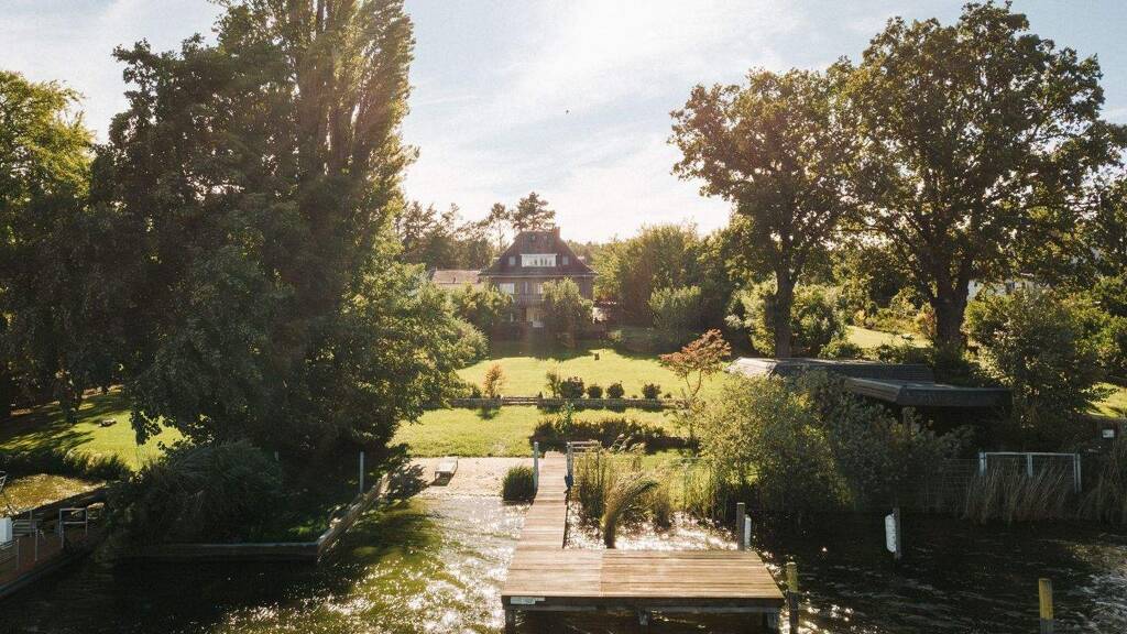 On a lakefront property measuring approximately 2,525 sqm, which gently opens up to the water, impressive views open up over Lake Krampitz, the stylishly landscaped gardens, and the forest area opposite. The private shore area has three spacious boat moorings with sufficient draft for sailboats, as well as its own small bathing area with a sandy beach - a discreet luxury that underscores the incomparable lifestyle of this location.
