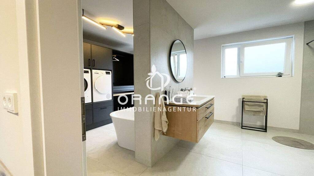 Völlig privat auch das Badezimmer, das vielmehr den Namen "Wellnessoase" verdient. Hier finden Sie wiederum eine sehr großzügige, bodengleiche Dusche und eine Toilette, abgetrennt durch einen mittig gesetzten Raumteiler, befindet sich auch noch eine Badewanne in diesem tollen Badezimmer, von wo aus Sie beim erholsamen Bad den Blick in die Landschaft genießen werden.