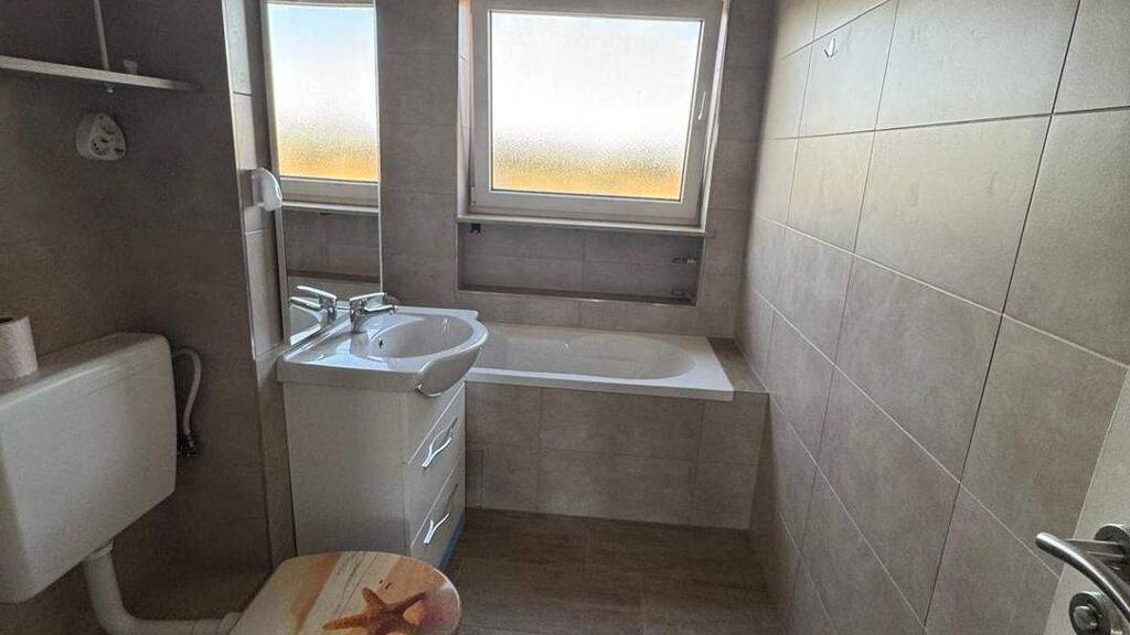 Gegenüber den beiden Zimmern befindet sich das Badezimmer, welches modern und vollständig gefliest ist. Es verfügt über eine Badewanne, ein Fenster sowie ausreichend Platz.