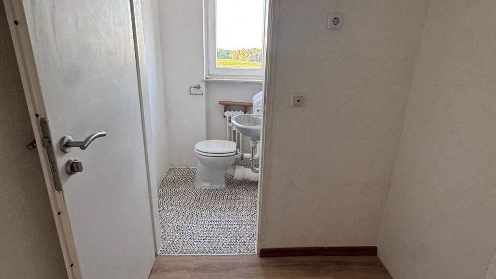 Beim Betreten der Wohnung gelangen Sie zunächst in den Eingangsbereich. Direkt auf der linken Seite befindet sich ein praktisches Gäste-WC mit Fenster und kleinem Waschbecken. Der Boden ist hier mit Fliesen ausgestattet.
