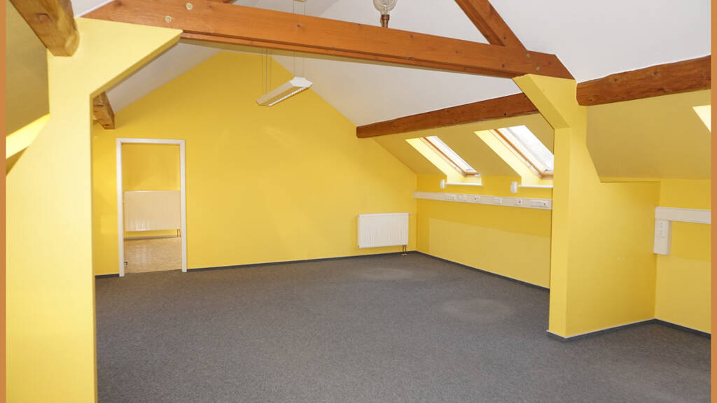 Über eine Treppe gelangen Sie ins Obergeschoss, das mit einem offenen und lichtdurchfluteten Raumkonzept überzeugt. Eine gemütliche Teeküche sowie ein Aufenthaltsbereich schaffen eine angenehme Arbeitsatmosphäre. Von hier aus erschließen sich vier großzügige und helle Büros mit großen Fensterflächen, die viel Tageslicht hereinlassen. Die offene Gestaltung bis zum Dach und die sichtbaren Holzbalken verleihen den Räumlichkeiten einen besonderen Charme. Für zusätzlichen Komfort sorgt eine eingebaute Klimaanlage, die ein angenehmes Raumklima zu jeder Jahreszeit gewährleistet.