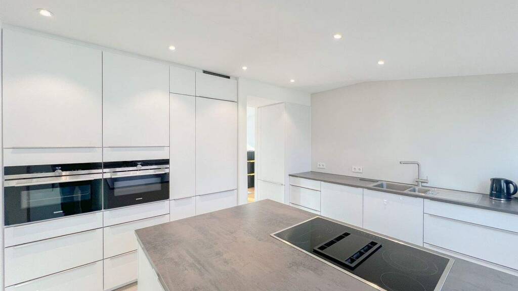 Die hochwertige Schreiner-Einbauküche mit weißen Fronten überzeugt insbesondere durch ihre edle Ausstattung mit Induktionskochfeld inklusive integriertem Abzug, großem Kühlschrank mit Gefrierfach sowie einer Siemens-Spülmaschine.