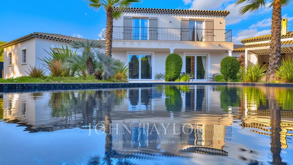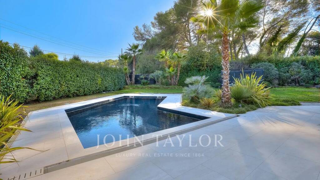 Eingebettet in eine beliebte Wohngegend, genießt diese schöne Villa mit ihrer zeitgenössischen und klaren Architektur eine strategische Lage in unmittelbarer Nähe der Mougins British International School, der Tennisakademie Mouratoglou, der Autobahn A8 und des Technologieparks Sophia Antipolis.