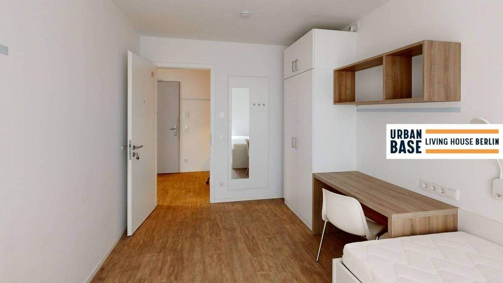 The private rooms at "Urban Base" impress with 10 to 16 m² of living space, intelligent and practical layouts, and high-quality, tasteful full furnishings, including a bed, wardrobe, picture rails, a coat rack with a mirror, a desk with a chair, as well as shelving and seating areas. Large windows bring plenty of light into the open floor plans, while underfloor heating ensures a comfortable indoor climate.