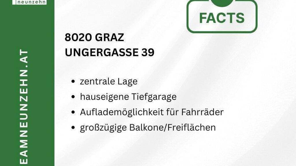 Willkommen im lebendigen und zugleich angenehm ruhigen Bezirk Gries! In der Ungergasse 39 erwartet Sie ein attraktiver Wohnbau mit hochwertig ausgestatteten 2- bis 3-Zimmer-Wohnungen. Die sonnigen Einheiten punkten mit durchdachten Grundrissen, großzügigen Außenflächen und bester Anbindung an das öffentliche Verkehrsnetz.
