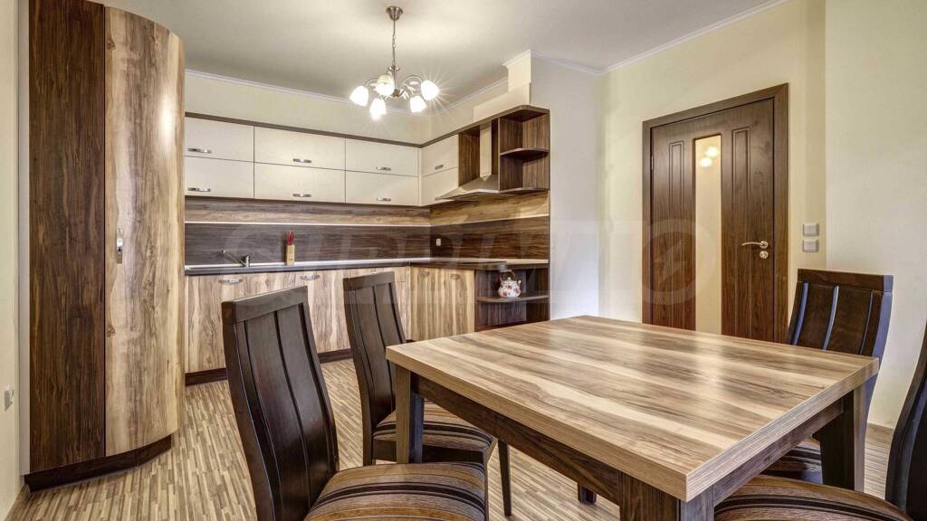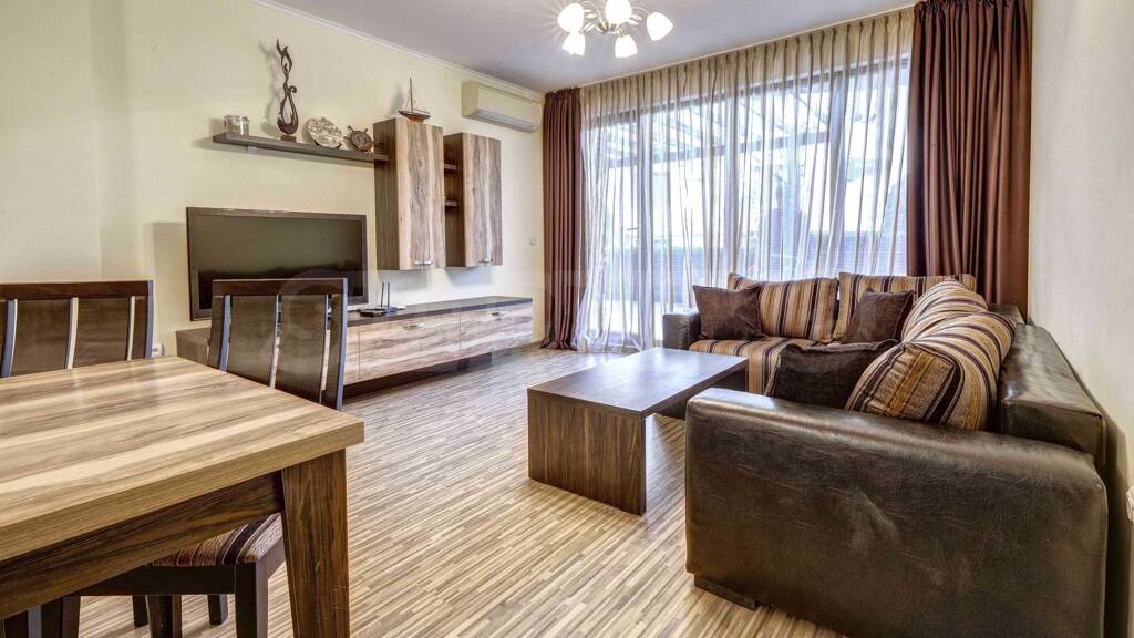 Die stilvoll eingerichtete Wohnung befindet sich im ersten Stock, ist nach Südosten ausgerichtet und hat eine Fläche von 104 m². Es verfügt über ein helles und geräumiges Wohnzimmer mit Küchenbereich, und vom Wohnzimmer aus haben Sie Zugang zu einer großen Veranda, die von Hecken und einem dekorativen Holzzaun umgeben ist, wo Sie Ihren Morgenkaffee oder ein Familienessen genießen können. Das Schlafzimmer hat die gleiche Süd-Ost-Ausrichtung und bietet Zugang zur Veranda. Das Apartment bietet ein ausgestattetes Badezimmer mit einer großen Badewanne für besseren Komfort sowie einen Schrank für zusätzliches Gepäck.