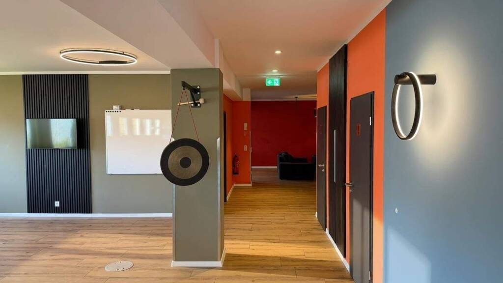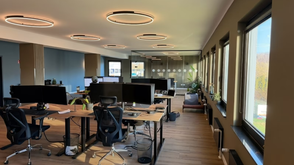 Die Bürofläche im 1. OG umfasst rund 216 m² und bietet eine moderne, hochwertige Ausstattung. Die Verkabelung erfolgt über Bodentanks mit CAT-6-Anschlüssen, wodurch eine flexible Arbeitsplatzgestaltung möglich ist. Für ein angenehmes Raumklima sorgen innenliegende Plissees als Sonnenschutz, während die smarte Lichtsteuerung eine bedarfsgerechte und energieeffiziente Beleuchtung gewährleistet.