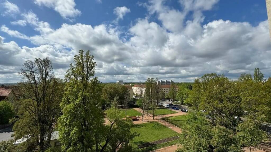 Die schön geschnittene 2-Zimmer-Wohnung liegt im 4. Obergeschoss des Hauses Stresemannplatz 11b und ist nach Südwesten ausgerichtet und uneinsehbar. Durch die großen Fenster entsteht eine helle Atmosphäre und der freie Blick geht über den Stresemannplatz mit dem liebevoll gestalteten Grünanlagenpark in Richtung "Großer Garten".