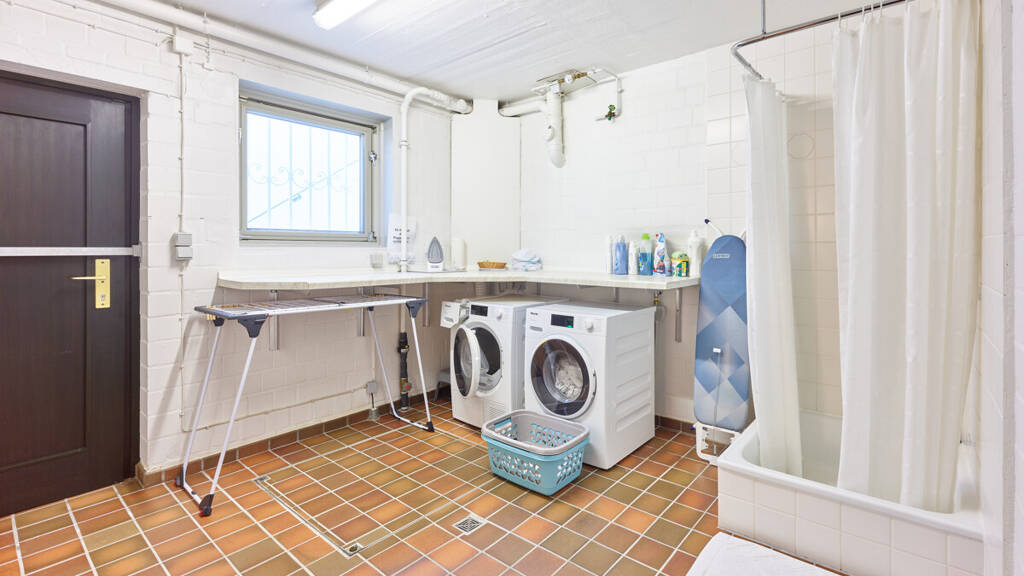 Der Vollkeller mit einer komfortablen Deckenhöhe von ca. 2,50 m ist auch von außen zugänglich. Auf einer Gesamtfläche von ca. 104 m² stehen Ihnen neben großzügigen Abstellmöglichkeiten auch ein Hauswirtschafts- und ein Heizungsraum zur Verfügung. Besonders hervorzuheben ist ein über ca. 40 m² großer Raum, der sich ideal als Großraumbüro oder Fitnessbereich nutzen lässt.