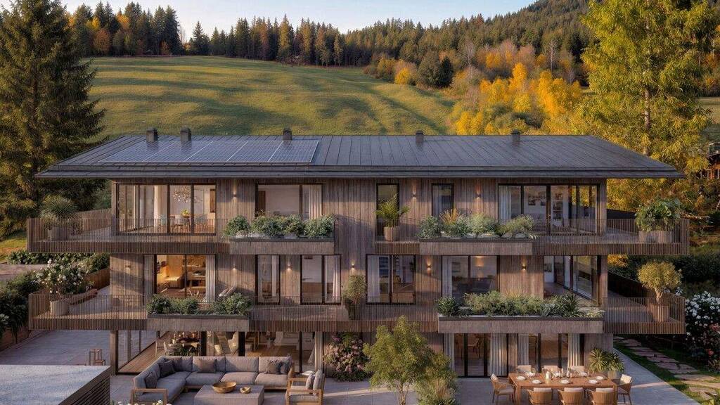 Hier vereinen sich moderne Architektur, alpine Materialien und nachhaltige Bauweise zu einem Wohnkonzept, das Ruhe, Komfort und Design miteinander verbindet.