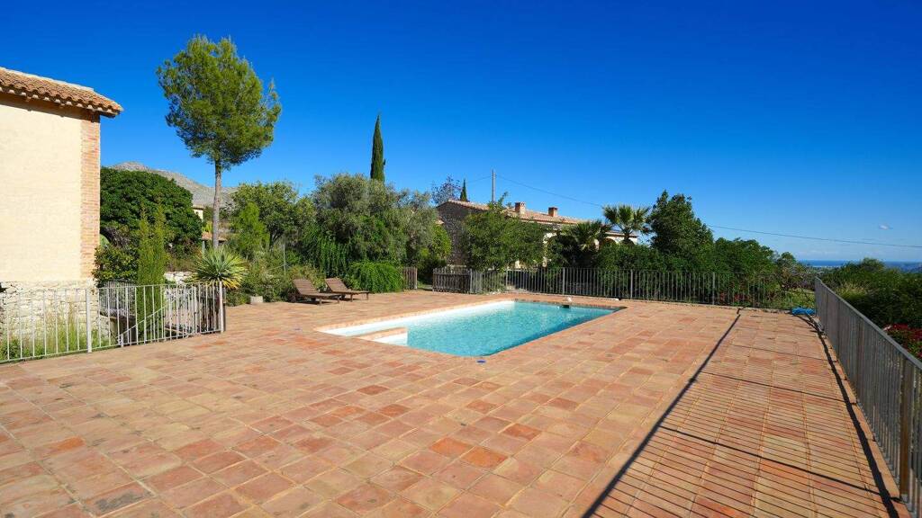 Im Zentrum des Anwesens sorgt ein stilvolles Wasserbecken mit Teich, eingerahmt von schlanken Zypressen, für eine ruhige und geschlossene Atmosphäre. Davor erstreckt sich die großzügige Poolterrasse, die als zentraler Aufenthaltsbereich dient und beeindruckende Ausblicke über das Tal bis zur Küste von Denia eröffnet. Ein darunterliegender Stauraum bietet ausreichend Platz für Technik, Lagerung und Betriebsmaterial.