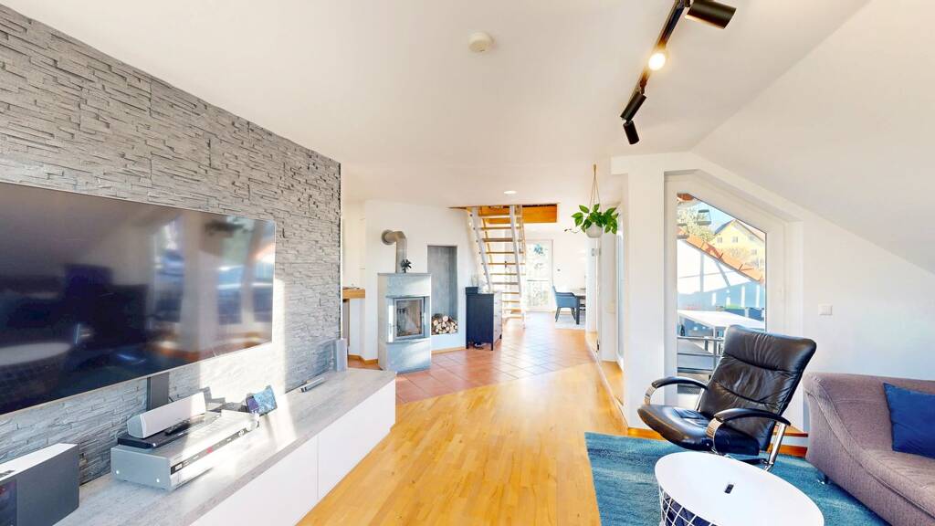 Treten Sie ein und entdecken Sie das harmonische Zusammenspiel von modernem Komfort und gemütlicher Atmosphäre. Auf einer reinen Wohnfläche von ca. 110 m² im Dachgeschoss präsentiert sich die Wohnung in einer großzügigen Raumaufteilung, die den perfekten Erholungsort bietet. Ein zusätzlich ausgebauter Bereich im Spitzboden (ca. 30 m²) eröffnet Ihnen weitere Möglichkeiten zur Nutzung. Hier finden Sie zwei weitere voll nutzbare Zimmer (aktuell Kinderzimmer & Büro).