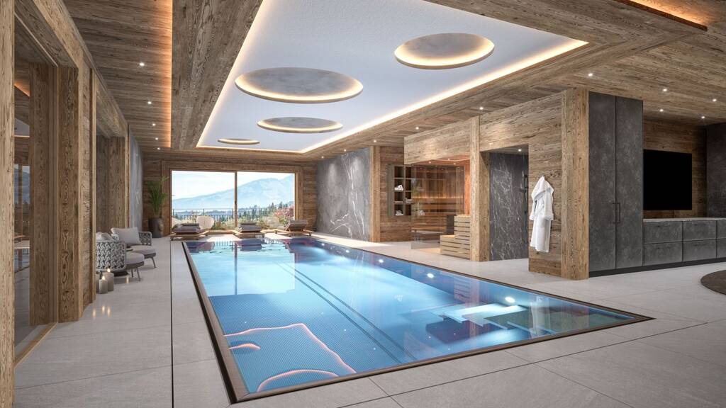 Ein exklusiver Wellnessbereich mit Indoor-Pool, Sauna, Fitnessraum und Lounge, ein stilvoller Weinkeller sowie eine ca. 196 m² große Tiefgarage ergänzen das Konzept.