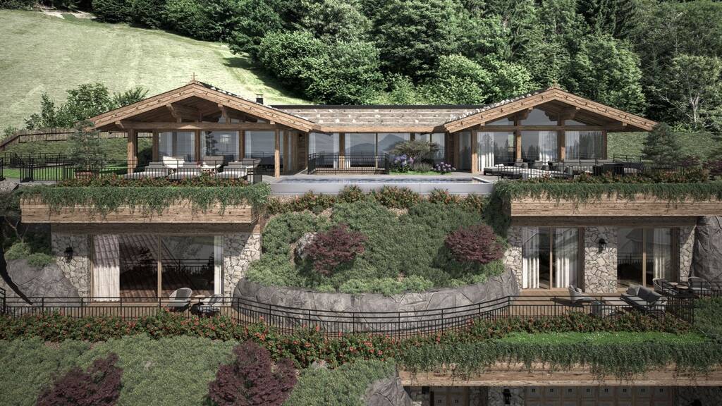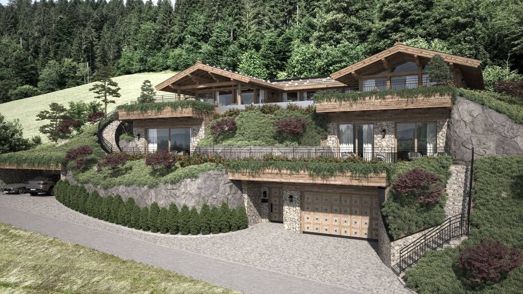 Das bestehende Landhaus bietet ca. 190 m² Wohnfläche mit durchdachter Raumaufteilung. Im Erdgeschoss befinden sich ein gemütliches Wohnzimmer mit Kachelofen, eine separate Küche und ein heller Erker mit Essbereich. Die angeschlossene Terrasse mit offenem Kamin eröffnet einen traumhaften Blick in die umliegende Bergwelt. Im Obergeschoss stehen mehrere Schlafzimmer mit Bädern und Balkon zur Verfügung, das Untergeschoss bietet Sauna, Hauswirtschaftsraum und Stauraum.