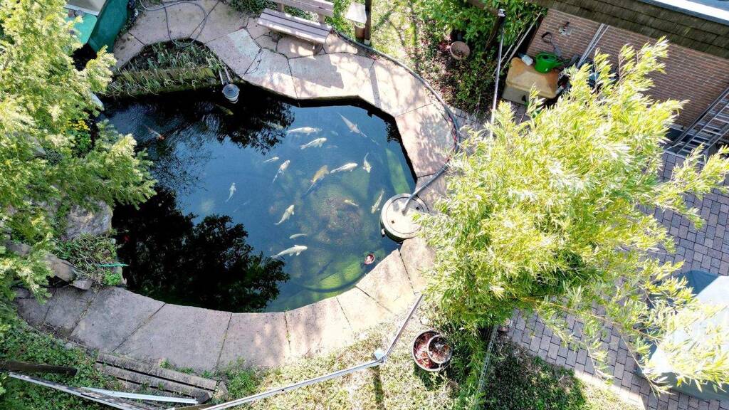 Das Haus ist von einem großen Grundstück umgeben und verfügt über reichlich Fläche für Fahrzeuge, Garten und Entspannung. Der schön angelegte Koi-Teich rundet das idyllische Bild der Gartenoase ab.