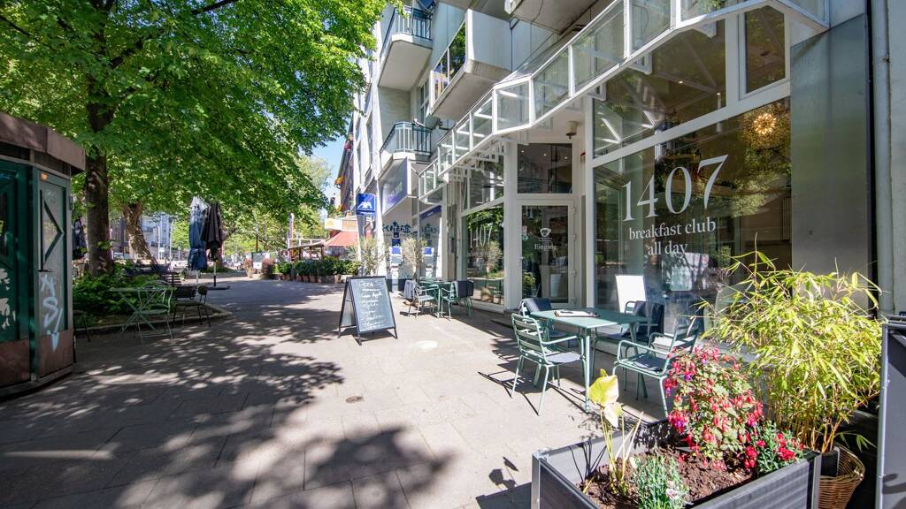 Besonders hervorzuheben ist neben den großen Fensterfronten die großzügige Terrasse im ruhigen Hinterhof. Die hohen Decken und die bodentiefen Fenster zur Straße verleihen dem Raum ein offenes, lichtdurchflutetes Ambiente mit einladender Ausstrahlung.