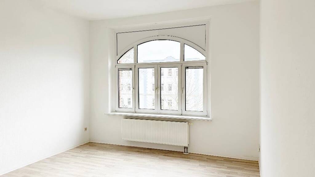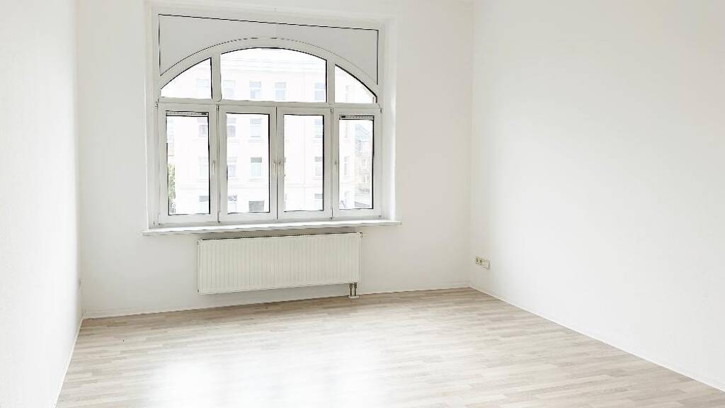 Das Wohnzimmer mit einer Größe von 20,46 m² ist großzügig geschnitten und bietet viel Platz für eine gemütliche Wohnlandschaft sowie einen Essbereich oder Arbeitsplatz. Durch den Altbaucharakter wirkt der Raum besonders luftig und hell. Der Laminatboden sorgt für eine warme Wohnatmosphäre und macht den Raum zum zentralen Lebensmittelpunkt der Wohnung.