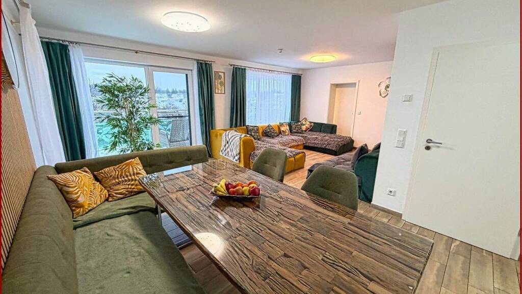 Der zentrale Wohnbereich ist großzügig und offen gestaltet. Große Fensterflächen sorgen für viel Tageslicht und eröffnen den Ausblick nach außen. Die moderne Einbauküche mit Bosch-Einbaugeräten ist direkt in den Wohn- und Essbereich integriert und bildet einen funktionalen Mittelpunkt. Der große Eckbalkon schließt unmittelbar an den Wohnbereich an und erweitert diesen nach außen - mit direktem Bezug zur Aussicht und kurzen Wegen zwischen Innen- und Außenraum. Die moderne Ausstattung ist auf Technik, Sicherheit und Komfort ausgerichtet. Smarthome-Komponenten (u. a. Hikvision), eine Videoüberwachung rund um das Haus sowie eine Alarmanlage mit Aufzeichnungsfunktion und Sensorik für Brand und Gas sind vorhanden. Ergänzt wird dies durch eine Sprechanlage mit Fernzugriff sowie integrierte Radios in den Bädern. In allen Wohnräumen sind Klimageräte mit Heiz- und Luftfilterfunktion installiert und ermöglichen eine individuelle Temperaturregelung. Elektrische, über Smart Home bedienbare Jalousien mit Zeitschaltung, Fliegengitter an den Fenstern, eine intelligente Heiz- und Warmwasserversorgung in Kombination mit Solar sowie eine durchgängige Fußbodenheizung ergänzen das technische Gesamtkonzept. Für TV- und Internet stehen sowohl eine Satellitenanlage als auch Starlink zur Verfügung.