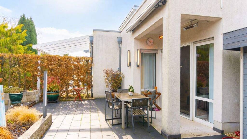 Ein besonderes Highlight stellt der liebevoll gestaltete Außenbereich dar. Die Terrasse ist teilweise überdacht und bietet dank integrierter Beleuchtung sowie eines Wärmestrahlers an der Decke ideale Voraussetzungen für entspannte Abende im Freien - auch in den kühleren Monaten. Der angrenzende Gartenbereich ist harmonisch angelegt und mit ansprechender Bepflanzung versehen, wodurch eine grüne Wohlfühloase entsteht, die sowohl zur Erholung als auch zur Freizeitgestaltung einlädt.
