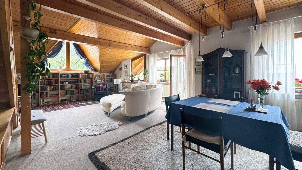 • Großer Wohn- und Essbereich, teilweise mit Galerie und offener Raumhöhe • Separate, helle Küche mit Fliesenboden mit Waschmaschinen- und Trockneranschluss • Einbauküche und Teilmöblierung inklusive • Zwei Bäder: Ein großzügiges Bad mit Badewanne, Dusche und WC sowie ein kleines Bad mit Dusche und WC – ideal für Familien oder Gäste • Schlafzimmer mit Ausgang zum Balkon • Große Empore im Dachspitz (Homeoffice, Gäste, Hobby oder Ausbaureserve) • Überdachter Balkon in Nordwestausrichtung für sonnige Nachmittage und milde Sommerabende
