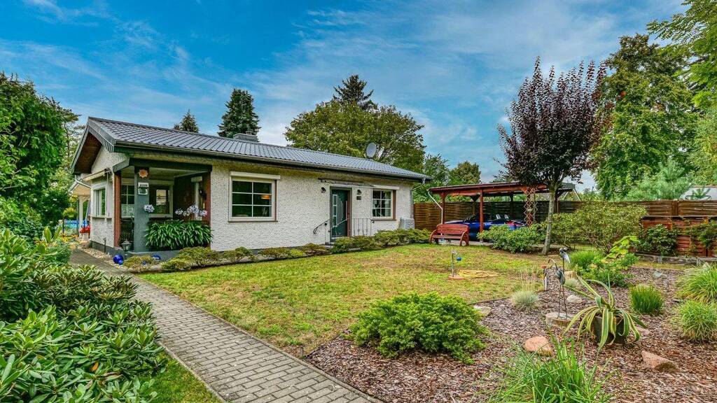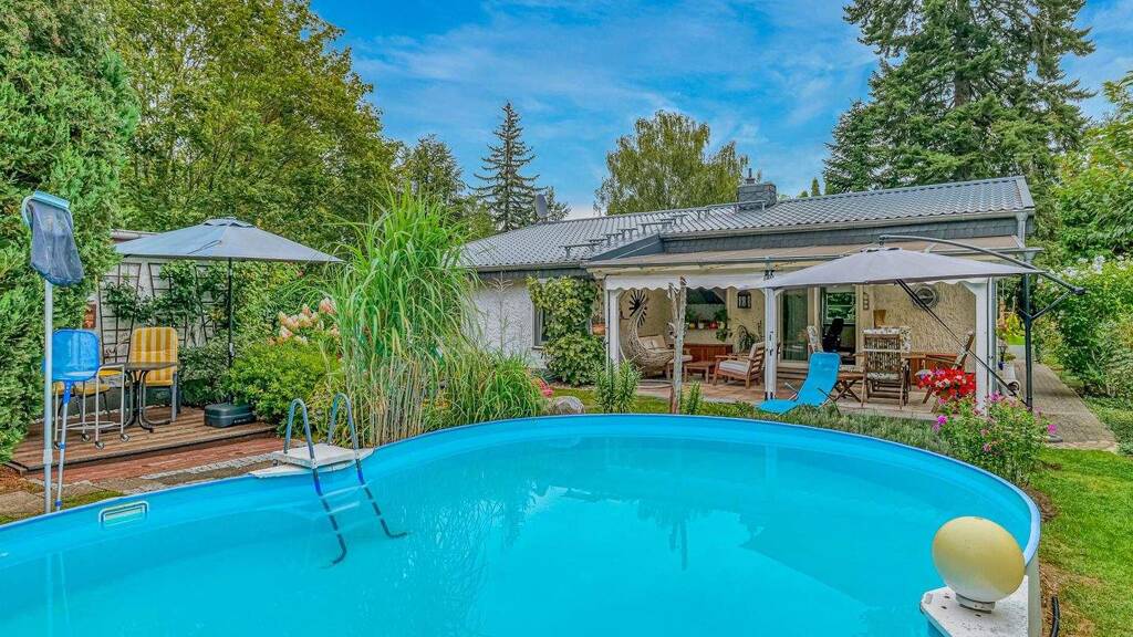 Kommen Sie rein. Das ist Ihr neues zu Hause. Dieser gemütliche Bungalow bietet genug Platz zur Entspannung. Im Sommer verbringen Sie Ihre Zeit auf der großen, überdachten Terrasse mit Westausrichtung und Blick in den wunderschönen Garten. Und zur Abkühlung schwimmen Sie eine Runde. Danach genießen Sie Ihr Getränk von der zweiten Terrasse, direkt am Pool. Am Abend lauschen Sie den Grillen, während Sie grillen. Ansonsten hören Sie hier nichts. So lässt es sich gut leben. Raumaufteilung: Nachdem Sie den Bungalow durch die Hauseingangstür betreten haben, befindet sich rechts das Lese-und Arbeitszimmer. Den Flur nach links abbiegend befindet sich die offene Küche mit angrenzendem Wohn-und Essbereich. Vom Essbereich gelangen Sie auf die kleine, überdachte Terrasse mit Südostausrichtung und Blick in den gepflegten Vorgarten. Hier können Sie am Morgen die ersten Sonnenstrahlen begrüßen, und Ihren Kaffee oder Tee genießen. Auf der anderen Seite des Essplatzes befindet sich der Zugang zur großen Südwest-Terrasse mit Blick in den wunderschönen Garten mit Pool. Auf der rechten Seite vom Flur befindet sich das Schlafzimmer. Daneben liegt das Bad mit Fenster und Badewanne, welches genug Platz für eine Waschmaschine und einen Wäschetrockner bietet.