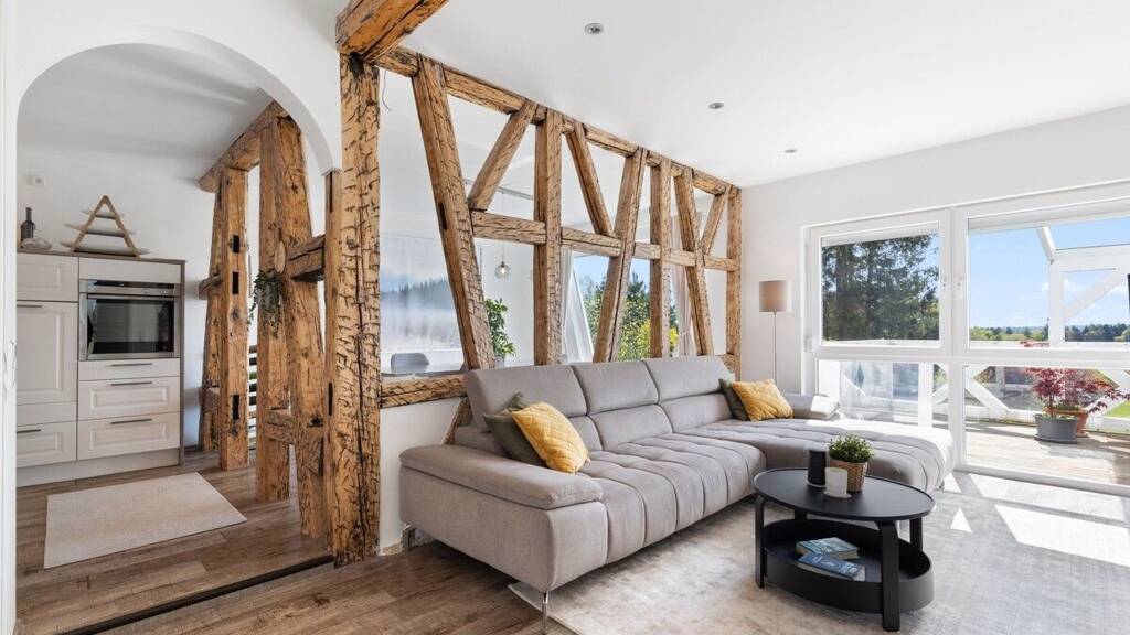 Sie betreten das Haus und gelangen über wenige Stufen in den Erdgeschossbereich dieser gepflegten Doppelhaushälfte. Dieser besticht durch seine offene Gestaltung, die Moderne und Historie verbindet. Das offene Fachwerk trennt den Wohn- vom Essbereich, der wiederum in die offene Küche übergeht. Hier genießen Sie den Blick in Ihren großzügigen Garten mit unverbaubarer Aussicht. An kalten Tagen wärmt Sie Ihr Schwedenofen und an warmen Tagen erreichen Sie vom Wohnzimmer aus Ihren Balkon. Ein Abstellraum und ein Gäste-WC runden das Erdgeschoss ab.