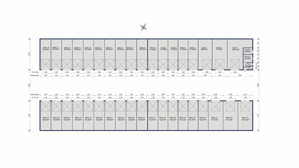 Die modernen Halleneinheiten sind in verschiedenen Größen, welche der aktuellen Planung entnommen werden können, verfügbar. Teilbar ab 45 m² - Kombination mehrere Abteile möglich, sowie Ausstattung nach Wunsch und Absprache. Der Hallenpark ist durch Tor- und Videoüberwachung gesichert, zudem 24 Stunden für Eigentümer oder Mieter zugänglich. WC und Technikversorgung fügen sich in den Baukörper der ersten Halle ein. Für Wohnmobil Fans bietet der Holiday Clean die nötige Ver- und Entsorgungsstation auf dem Grundstück.