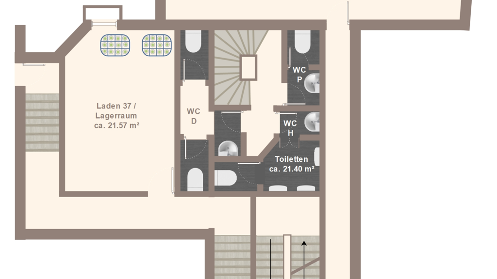 Ideal für schöne Sommertage, bietet die 54 qm große Terrasse den Kunden vor dem idyllischen Brunnen Platz um den Tag ausklingen zu lassen. Die Terrassenfläche ist von der Gemeinde angemietet. Im Untergeschoss der Einheit befinden sich die Toiletten mit einer Fläche von 21,40 qm sowie zwei Kellerräume mit einer Fläche von 50,41 qm. Im Hof befinden sich 4 Stellplätze im Freien, die im Kaufpreis inbegriffen sind. Öffentliche Parkplätze sind gegenüber dem Objekt vorhanden.