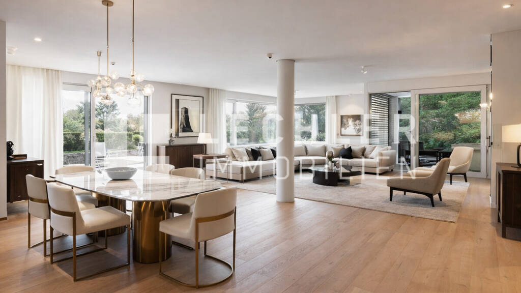 Zur luxuriösen Ausstattung zählen eine maßgefertigte Einbauküche mit Premium-Elektrogeräten, individuelle Schranklösungen, hochwertiges Echtholzparkett sowie edle Fliesen.