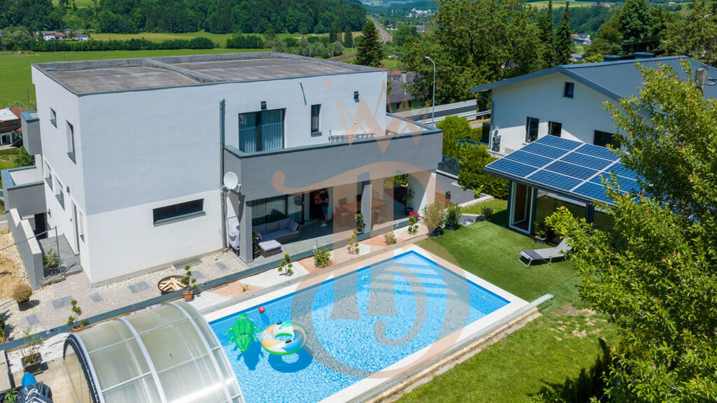 HIGHLIGHTS -2 separat begehbare Wohneinheiten -2 Doppelgaragen (somit 4 Garagenstellplätze) -Swimming pool mit Überdachung (L: 8x4; T:1,5m) -Gartenhaus mit Infrarotsauna -Fitness- & Hobby Raum -1 überdachte Terrasse und -4 sonnige Balkone mit wunderschönem Ausblick uvm.