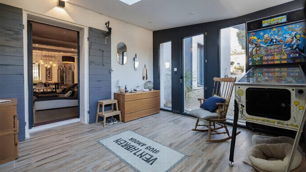 The house offers a master suite on the ground floor with its own shower room, while the upper floor houses a bathroom serving three bedrooms and a mezzanine office, creating a harmonious and perfectly laid-out sleeping area.