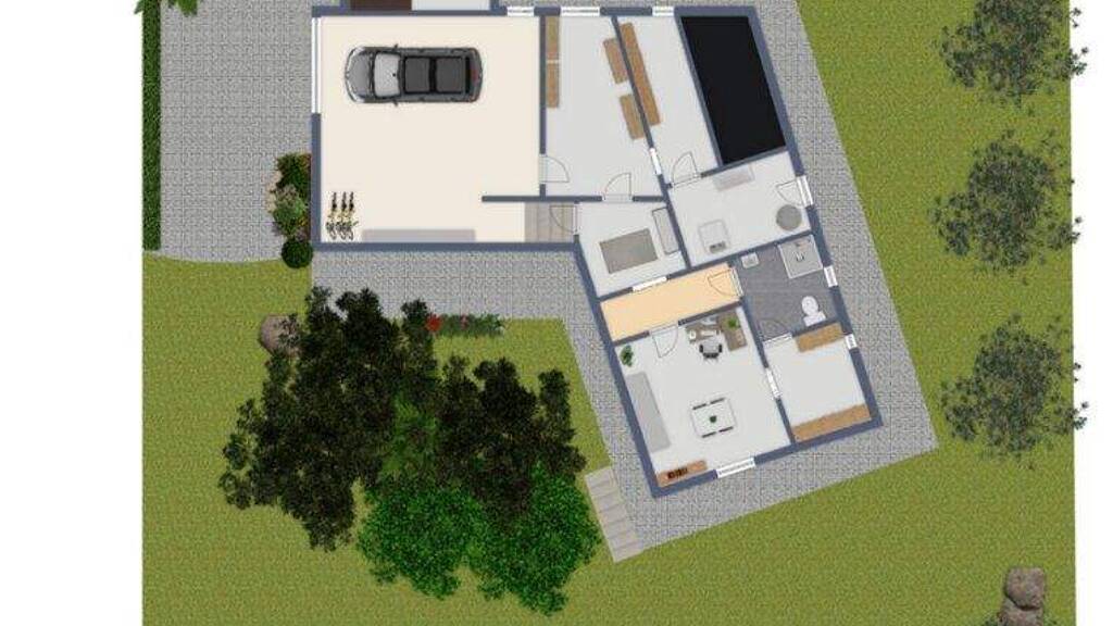 Der Bungalow verfügt über drei Zimmer, die individuell als Schlaf-, Kinder- oder Arbeitszimmer genutzt werden können, sowie über ein großzügiges Wohnzimmer, das durch einen gemütlichen Kachelofen eine besonders angenehme Wohnatmosphäre schafft. Beheizt wird das Haus über einen Pelletkessel, der sich im Keller befindet.