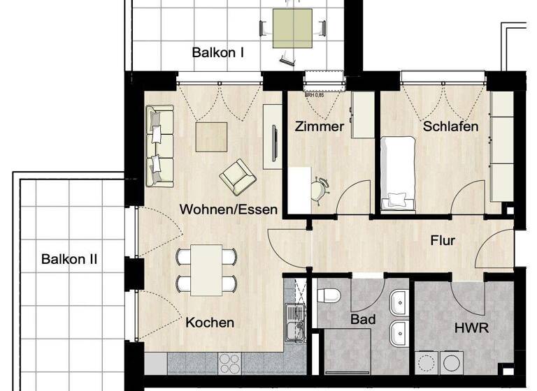 Komfort wird hier großgeschrieben: Das Badezimmer ist mit einer bodengleichen Dusche ausgestattet und bietet damit nicht nur modernen Komfort, sondern auch barrierearme Bewegungsfreiheit. Elektrische Raffstores sowie dreifach verglaste Fenster sorgen für optimale Lichtverhältnisse und effizienten Schallschutz. Der verbauten pflegeleichte Linoleum-Boden unterstreicht den hochwertigen Charakter der gesamten Wohnung. Zwei großzügige Balkone - einer nach Süden, einer nach Westen ausgerichtet - bieten zusätzlichen Raum im Freien und laden zum Verweilen ein.