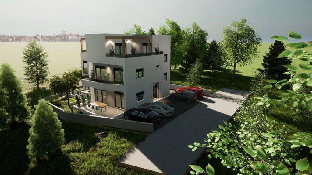 Eine Innentreppe führt ins erste Obergeschoss mit zwei Schlafzimmern, jeweils mit eigenem Bad und Zugang zu einer gemeinsamen Terrasse. Dieses Konzept gewährleistet maximale Privatsphäre für Familienmitglieder und Gäste und bietet gleichzeitig viel Platz und ein luftiges Ambiente. Im zweiten Obergeschoss befindet sich ein drittes Schlafzimmer, ebenfalls mit Bad und Zugang zu einer 17,31 m² großen privaten Terrasse. Von dieser Terrasse aus genießt man einen herrlichen Blick auf das Meer und die umliegende Natur - ruhige Grünflächen und mediterrane Häuser, die eine typisch dalmatinische Atmosphäre schaffen.