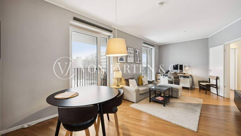 Der großzügige Wohn- und Essbereich ist das Herzstück der Wohnung. Hier trifft modernes Design auf gut gewählte Materialien: Das Parkett verleiht dem Raum eine warme Atmosphäre, während die große Fensterfront für eine helle und freundliche Wohnatmosphäre sorgt.