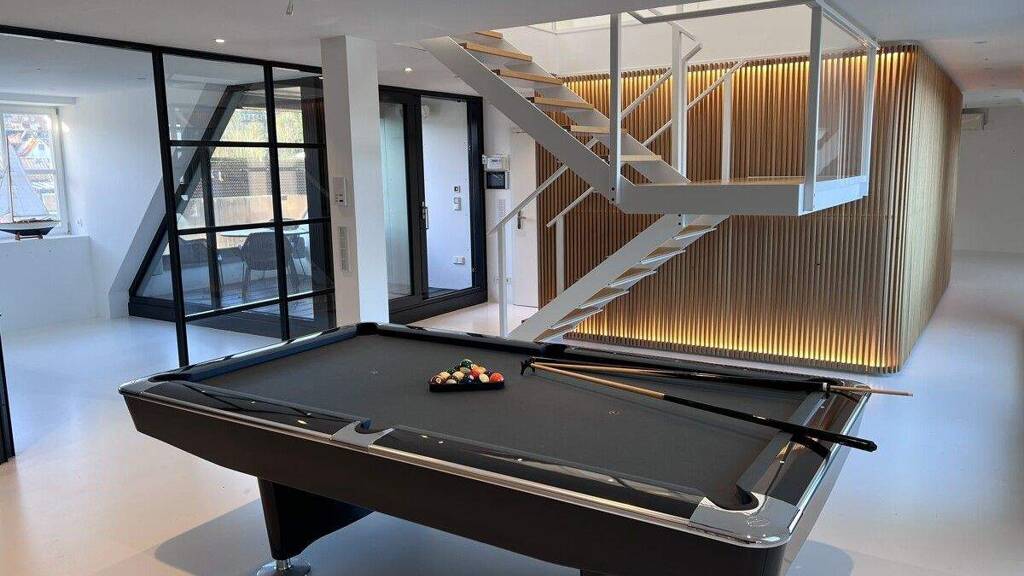 Durch die Glaswände der unteren Ebene entsteht ein offenes und helles Raumkonzept, welches durch den weißen, gegossenen Bodenbelag unterstrichen wird. Zwei einladende Balkone, einer mit Panoramablick über die Flensburger Förde, runden dieses Angebot ab. Ein WC sowie ein Duschbad sind ebenfalls vorhanden.