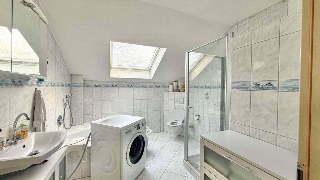 Das Tageslichtbad kombiniert Badewanne und Dusche und verbindet praktischen Komfort mit einem zeitgemäßen Erscheinungsbild.