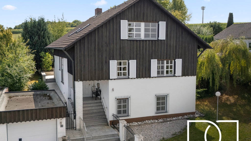 Das Haus wurde in Massivbauweise errichtet und steht auf einem 784m² großen Grundstück mit edlem Metallzaun. Die Immobilie verteilt sich über Erdgeschoss, Obergeschoss und einen ausgebauten Wohnkeller. Zwei großzügige Terrassen - eine südlich, eine westlich ausgerichtet - bieten sonnige Rückzugsorte mit viel Platz zum Entspannen. Die Außenbereich ist parkähnlich gestaltet und garantiert absolute Privatsphäre. Eine Garage mit elektrischem Sektionaltor sowie zwei zusätzliche Stellplätze vor dem Haus runden das Gesamtbild funktional ab.