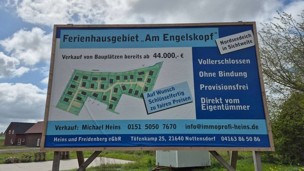 Das hier angebotene Baugrundstück befindet sich im Ferienhausgebiet Am Engelskopf, ein Baugebiet mit 30 Bauplätzen, umringt von Felden und Weiden, in Sichtweite zum Nordseedeich. Weitere Grundstücke stehen auf Anfrage zur Verfügung.