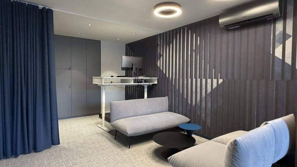 Die Fläche zeichnet sich durch Modernität, Helligkeit und eine intelligente Raumaufteilung aus, die eine hohe Funktionalität gewährleistet. Neben separaten Büroräumen umfasst sie eine Küche mit Essbereich, separate Damen- und Herrentoiletten, einen Empfangsbereich und einen Konferenzraum. Die Büroräume sind durch große Glaswände voneinander getrennt, was für ein offenes Raumgefühl sorgt. Dank der hellen und freundlichen Farben und der hohen Decken ist die gesamte Fläche angenehm und einladend, was zu einer besseren Arbeitsatmosphäre und höherer Produktivität beiträgt.