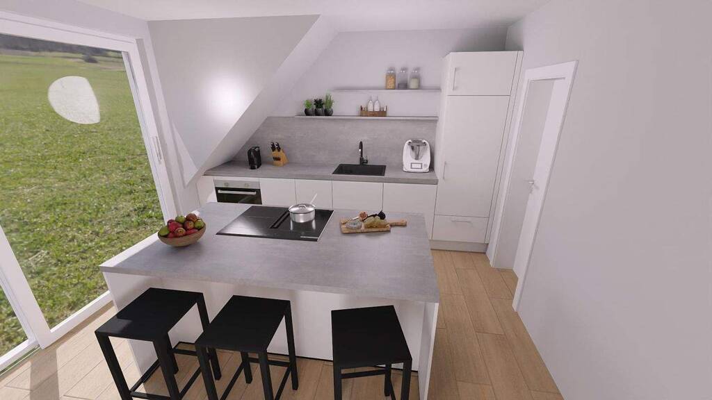 Nach Fertigstellung erwartet Sie ein einladender Wohn- und Schlafbereich, der mit einem eleganten Designerboden ausgestattet wird und eine harmonische, moderne Atmosphäre schafft. Die integrierte Einbauküche fügt sich stilvoll in den Raum ein und bietet alle wichtigen Funktionen für den täglichen Komfort.