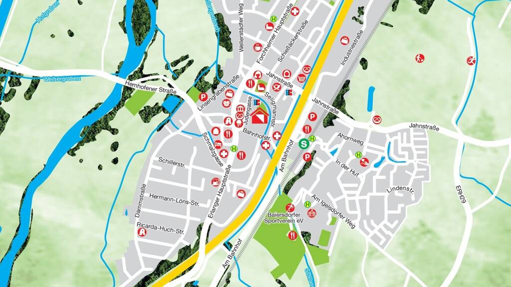 Die Judengasse ist eine ruhige und gepflegte Anwohnerstraße, nahe der Altstadt von Baiersdorf. Geschäfte des täglichen Bedarfs sind daher fußläufig erreichbar. Der S-Bahnhof ist nur fünf Gehminuten entfernt. Einkaufsmöglichkeiten vom kleinen Obst- und Gemüseladen bis zum großen Supermarkt sind in nur wenigen Fußminuten erreichbar.