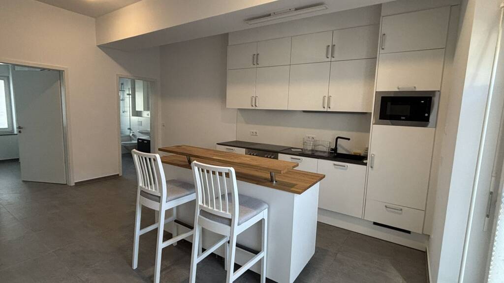 - Bereits eingebaute, hochwertige Einbauküche, inkl. Kühlschrank, Cerankochfeld und Keramik-Spüle