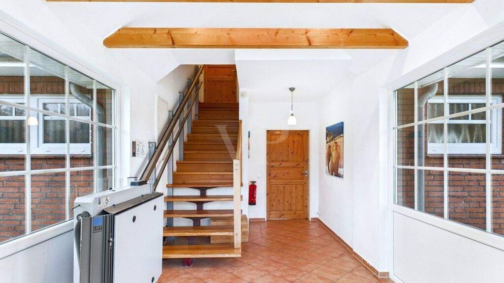 Über den ca. 12 m² großen und hellen Wintergartenanbau vor dem Haus gelangen Sie zu beiden Wohneinheiten. Extrabreite Türen, rollstuhlgerechte Bewegungsflächen, befahrbare Duschen, ergonomisch anpassbare Waschtische und gleich mehrere Pflegebetten machen die Wohnung ideal für Familien, Menschen mit Assistenzbedarf oder Senioren, die komfortabel und sicher leben möchten.