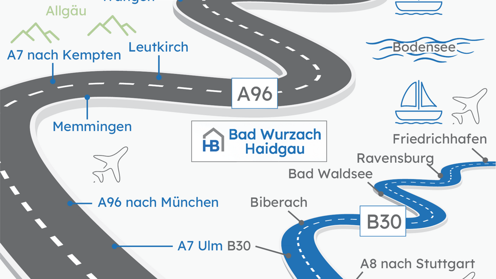 Die verkehrsgünstige Lage ist ein Plus für Pendler: für eine schnelle Anbindung an die B30 sorgt der Zubringer (L300), der Sie in wenigen Minuten nach Bad Waldsee oder weiterführend nach Biberach, Ravensburg oder Friedrichshafen bringt. Richtung Süden ist die A96 über Bad Wurzach, Leutkirch sehr gut erreichbar, welche über Lindau in die Bodenseeregion und Österreich/Vorarlberg führt oder über Memmingen ins weitere Allgäu.