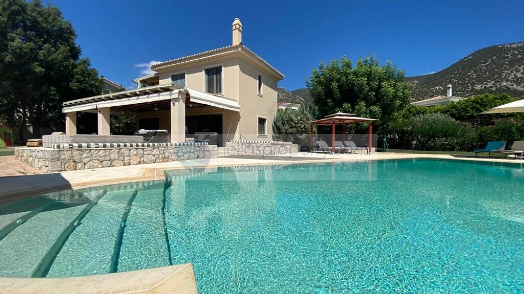 Der Garten ist flach und rund um das Haus professionell angelegt, mit sehr schönen Baumpflanzungen, angelegte Wegen welche gut mit den Außenflächen aus Naturstein harmonieren. Große Eck-Pergola, die in Kombination mit dem Pool zur architektonischen Schönheit des Hauses beitragen