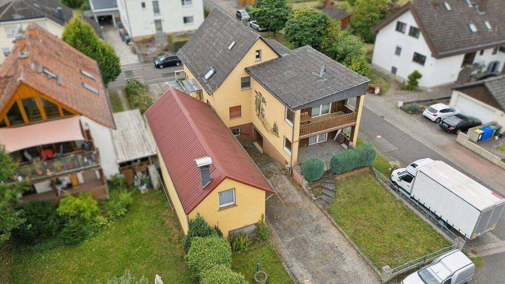 Ergänzt wird die Immobilie durch eine Garage mit Anbau, der aktuell als Werkstatt genutzt wird und zusätzliche Nutz- und Gestaltungsmöglichkeiten bereithält. Das Wohnhaus wurde 1958 errichtet und 1979 erweitert, während die Garage aus dem Jahr 1967 stammt und 1973 um den Anbau ergänzt wurde.