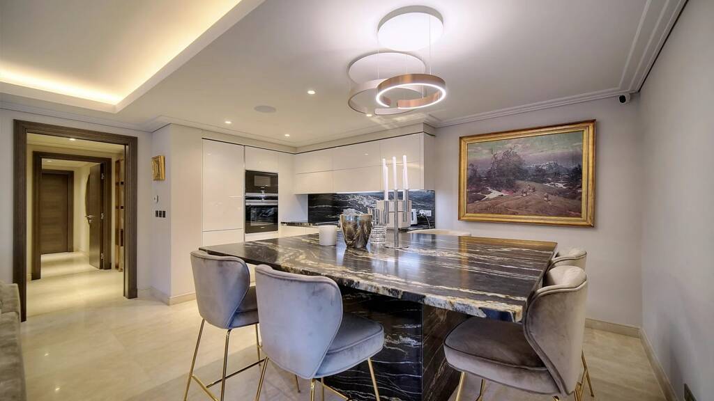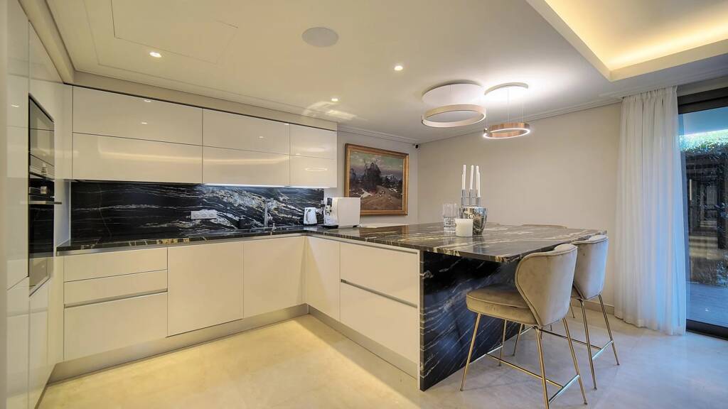 Luxurious 3 bedrooms and spacious living room with an open plan kitchen and 2 bathrooms and the guest wc, all using up-to-date high end finishes, as well as the huge terrace that is wrapped around the whole apartment, with BBQ station and private swimming pool with an automatic slatted cover, play area for kids and adults.