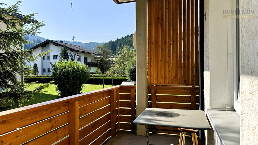 Von der sonnigen Loggia aus genießen Sie entspannte Momente mit Blick ins Grüne - ideal, um den Tag ruhig ausklingen zu lassen.