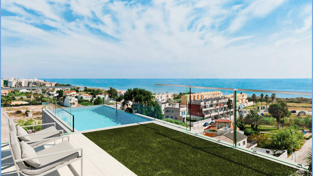 Exklusive Neubau 3-Zimmer-Wohnung mit ca. 81 m² großer Dachterrasse, privatem Pool und traumhaften Meerblick in Platja d`Oliva